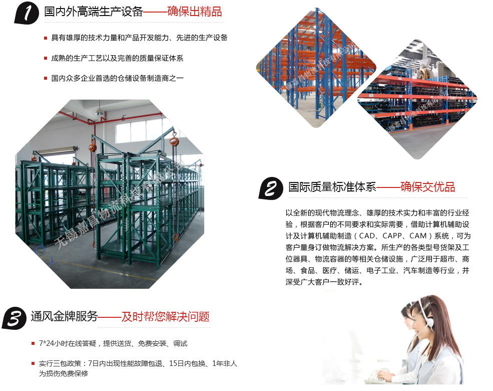 無錫嘉昌倉儲貨架有限公司擁有多年的設計、生產、管理經驗。以全新的現代物流理念、雄厚的技術實力和豐富的行業經驗,根據客戶的不同要求和實際需要,借助計算機輔助設計及計算機輔助制造(CAD、CAPP、CAM)系統,可為客戶量身訂做物流解決方案。所生產的各類型號貨架及工位器具、物流容器的等相關倉儲設施,廣泛用于超市、商場、食品、醫療、儲運、電子工業、汽車制造等行業,并深受廣大客戶一致好評。